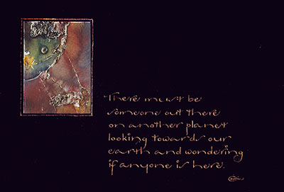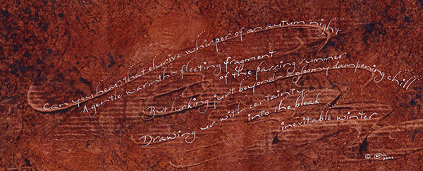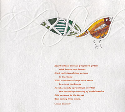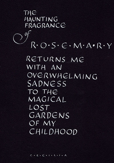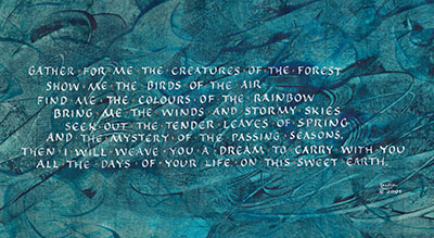 Forest I wrote this for each of my three children and when Adam asked me to read it at his wedding to Justine, I wrote a further verse for them. Written on one of my paste papers, with William Mitchell metal nib and white gouache. Gather for me the creatures of the forest Show me the birds of the air Find me the colours of the rainbow Bring me the winds and stormy skies Seek out the tender leaves of Spring And the mystery of the passing seasons. Then I will weave you a dream to carry with you All the days of your life on this sweet earth. |