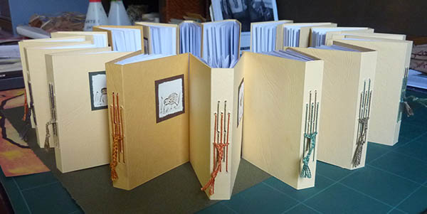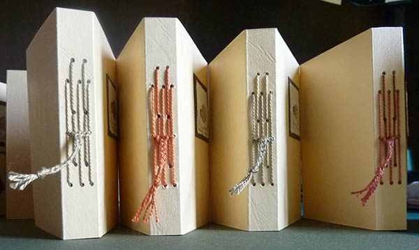 This is a simple binding, with the five sections individually pamphlet stitched through the spine and knotted on the outside before being plaited together. I used pearl embroidery thread in a couple of different colours. |