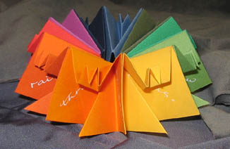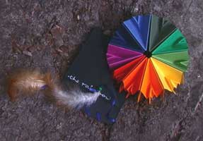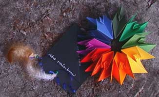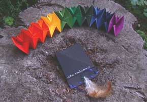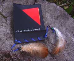 The Rainbow Book, made of Canson Mi-Teintes paper, nestles in its pouch which is stitched with fine ribbon and trimmed with feathers and beads | |