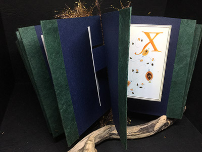 in a leather-bound book to acknowledge all those who helped to build a Hungarian church outside Melbourne. Each page contained names beginning with one of the letters of the alphabet, and to avoid a monotonous look I made the initial letters down the page gradations of the decorated versal which was on the opposing page. Each letter of the alphabet had its own colour combinations and elements taken from traditional embroideries. I scanned each of the pages on completion and years later decided to make a concertina book using reduced size images. It was a very long book, with the photos standing out from each page. I have never really known how to display the book, and in some way I prefer it curled into a circle where you can't even see the painted letters! |