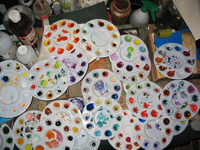 ![]() This is just a few of the palettes with my colour schemes for each letter. I used Winsor &Newton artist quality watercolour tubes. I continued to use these palettes for months after completing this commission as the paint was too expensive to just discard. |